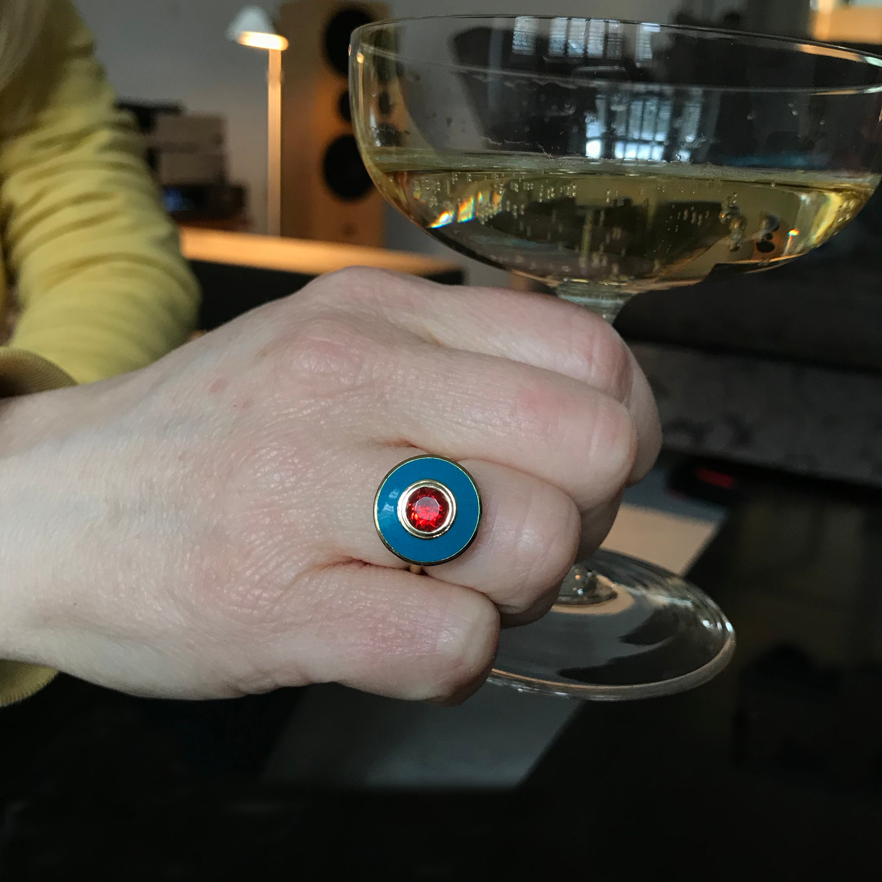Lisa loves her colours, and the combination she loves most of all is orange and turquoise. In designing her ring, the opaque turquoise vitreous enamel was a given, but it took years to find the orange fire opal for the center.