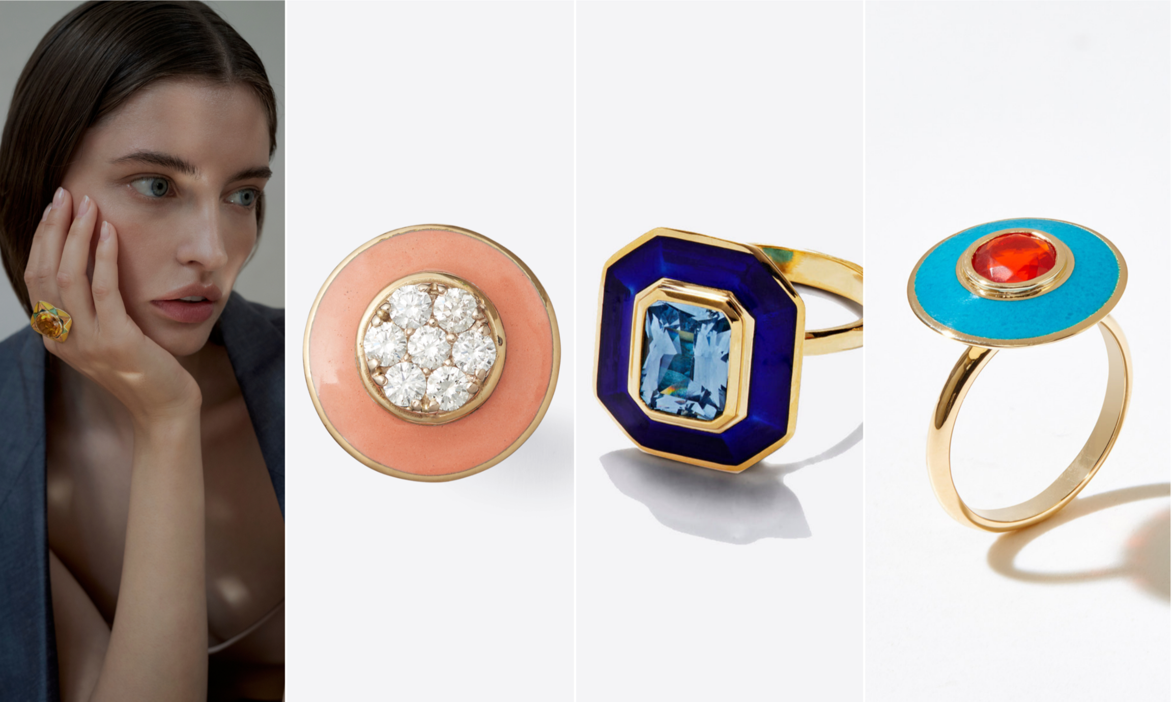 Nearly two decades ago, I was asked to design an engagement ring that would be an alternative, fresh approach to this special occasion. This wide-open assignment gave me the chance to step outside the box of solitaire diamond rings. Working closely with the couple, I explored exciting, fresh materials like enamel, family heirlooms, and an array of stones and metals to create something perfect for this adventurous, imaginative couple.