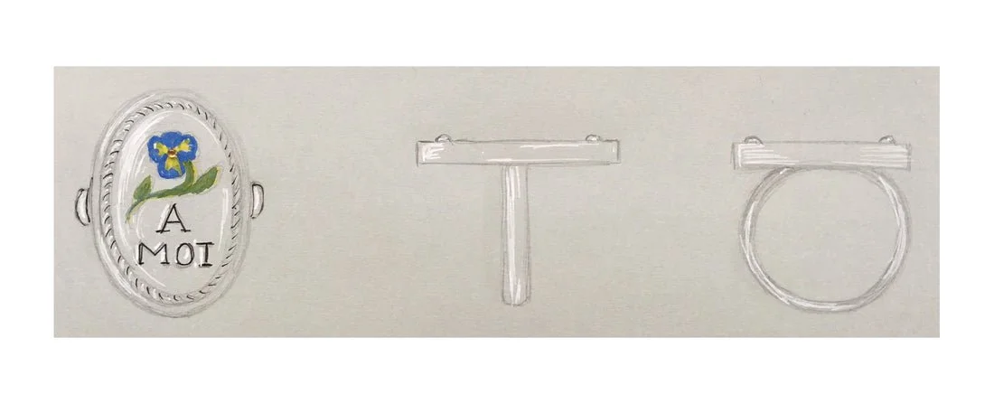 The word 'pansy' is derived from the French word "pansee" meaning "thought". This lovely flower is therefore a symbol of remembrance. When a pansy and the words "A Moi" are joined together, they read "pensez a moi" or "think of me". This ring is thus a love token encouraging the wearer to think of her beloved.