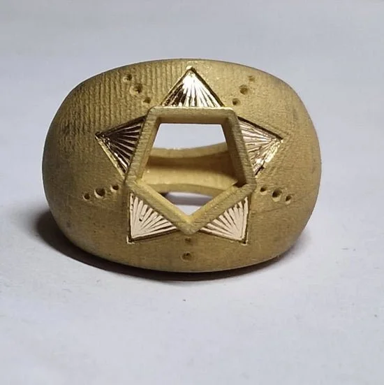 Engraving the five points added that extra sparkle along with some pave diamonds. Made out of recycled gold showing love for mother earth only deepened its beauty while your eyes fall into the pool of deep blue, green, and burgundy hues of the galaxy.