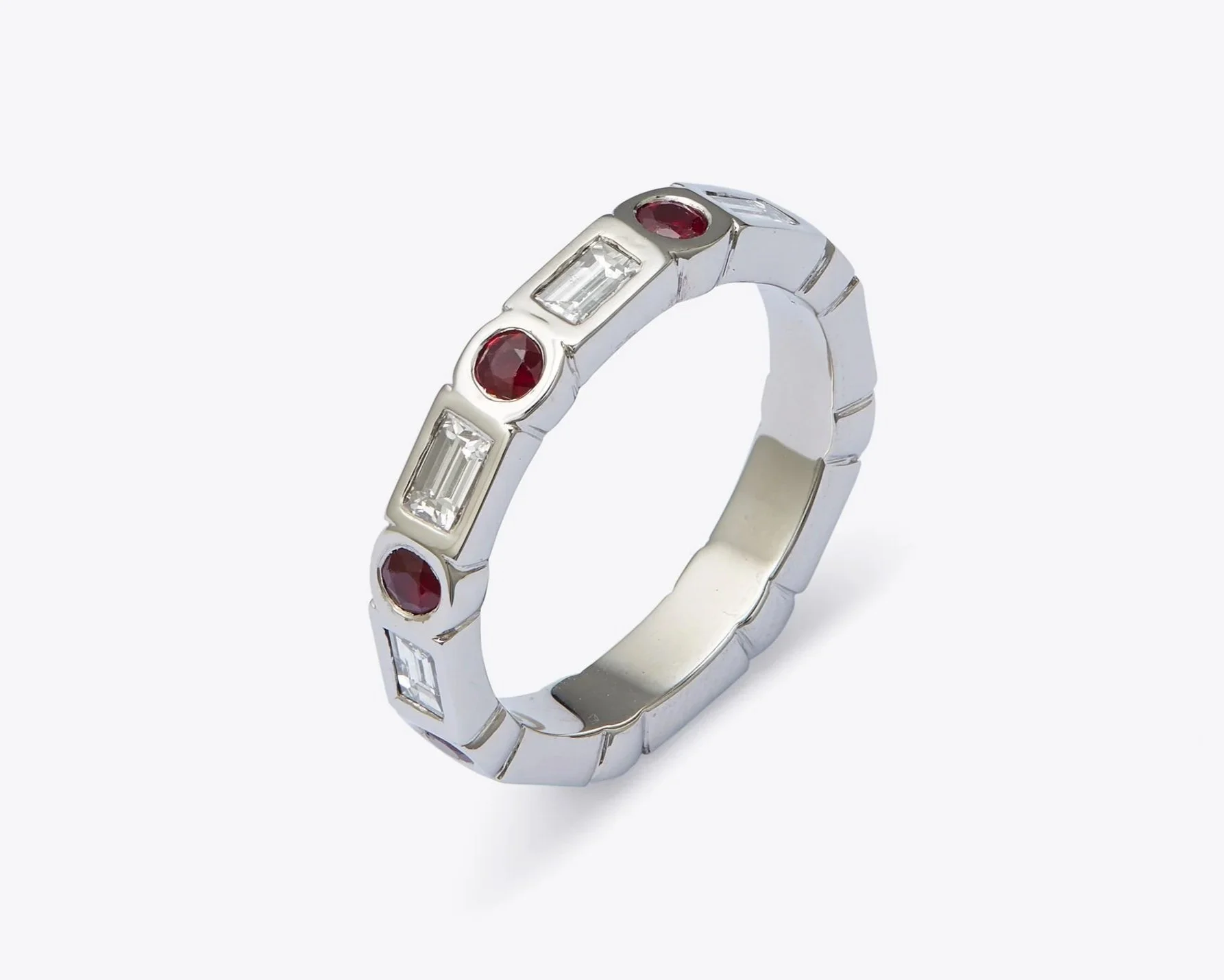 Crafted in platinum for its strength, safety, and longevity, the band is built to last a lifetime and beyond. Art Deco lines frame rubies and diamonds with precision, resulting in a ring that is resilient yet refined — a modern heirloom born from love, loss, and renewal.