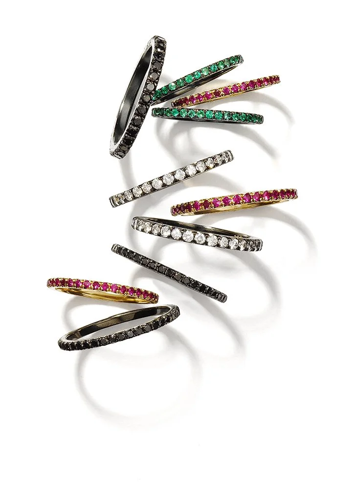 Crafted in 18k yellow gold with black rhodium, set with rubies, emeralds, blue sapphires, and diamonds, the bands speak to a profound connection, one that nurtures love.