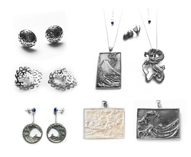 Tarra presented an exquisite collection of handcrafted silver pendants and earrings, where sculptural forms evoke the fluid power of ocean waves entwined with the mythic elegance of dragons. Drawing inspiration from The Great Wave off Kanagawa by Katsushika Hokusai, each piece reflects the enduring legacy of one of the most iconic images in Japanese art.