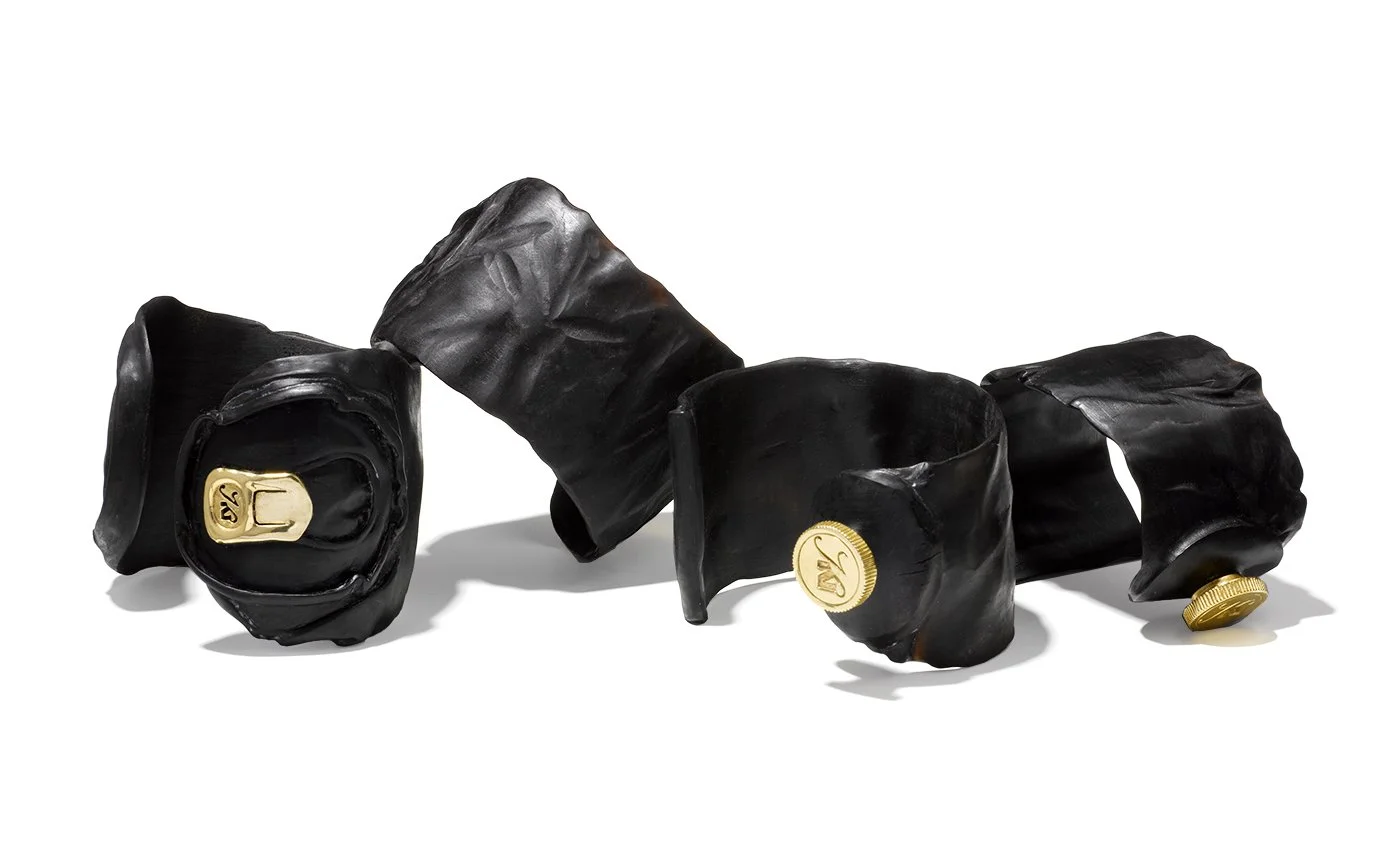 The bold cuffs further explore the tension between luxury and the organic, infused with a sense of wit. Hand-carved in horn, they are sculpted into unexpected, tongue-in-cheek forms, a crushed soda can, a flattened toothpaste tube—elevating the everyday into objects of intrigue. Their corresponding caps, reimagined in silver and gold plating, complete the narrative with a refined yet playful finish, echoing the distinctive design language Sean brought to The Line Hotel.