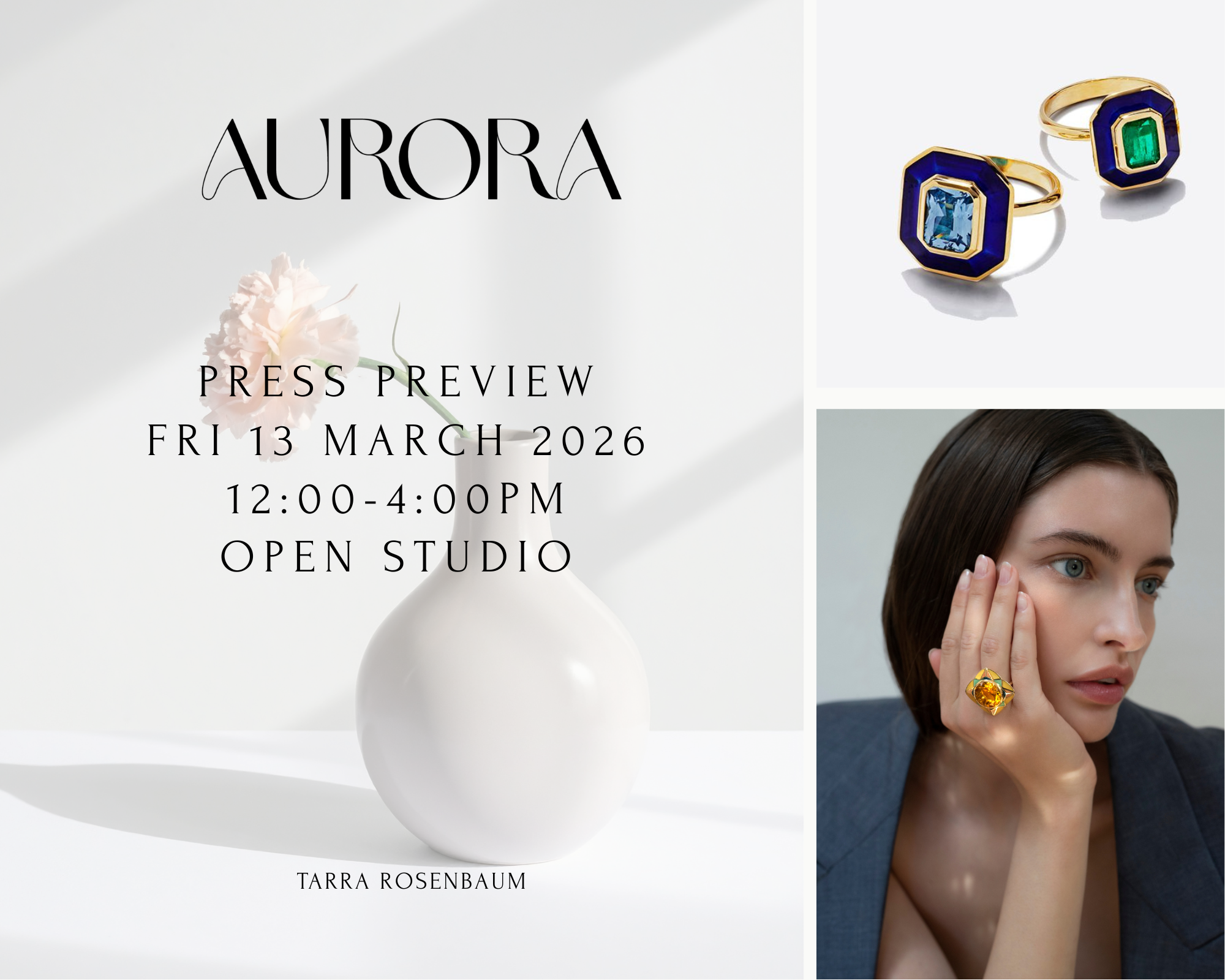 During the afternoon, I will be presenting the AURORA collection, a deeply personal body of work that marks a new chapter for Tarra Rosenbaum. The open studio is an opportunity to see the pieces up close, explore the stories behind them, and share a conversation about the creative journey that shaped them.